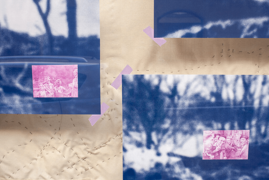 De este modo, Elián Stolarsky juega con el punto de vista del espectador, ya que, dado el tamaño y nitidez de ambas imágenes, éste nunca podrá contemplar la pieza en su totalidad. Si uno las observa de lejos, podrá ver el fondo, pero no la pequeña estampa que se cuela en ellas. Y lo mismo sucede si uno se acerca a verlas, siendo el fondo esta vez el que se desdibuja. Con ello, la artista habla sobre la imposibilidad de obtener una imagen completa y objetiva del pasado. Del mismo modo, la pieza textil que culmina la muestra es parte de la escenografía. Se trata de un telón de fondo atravesado por caminos de hilo que también comienza a descifrarse a medida que uno toma distancia.
